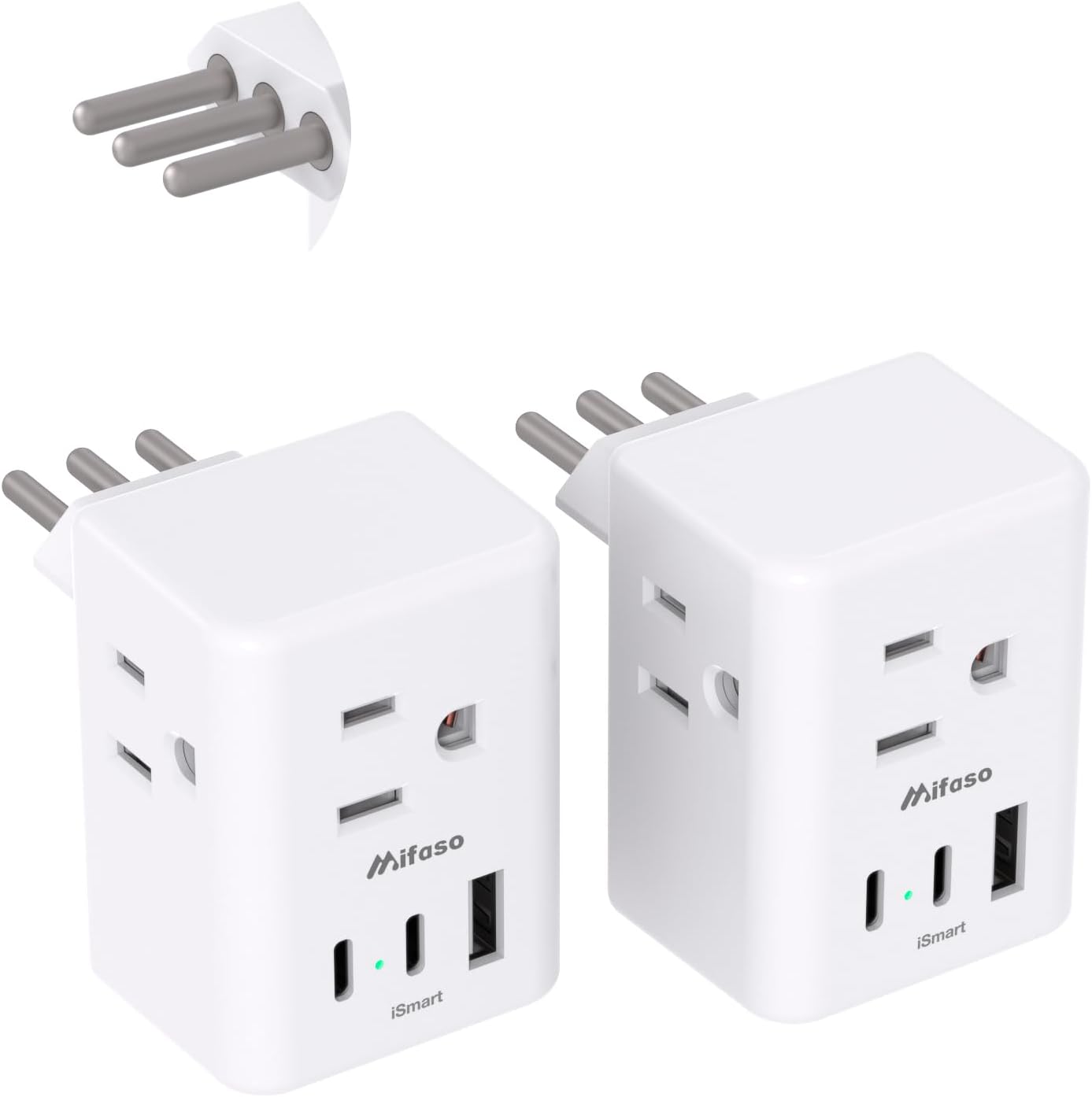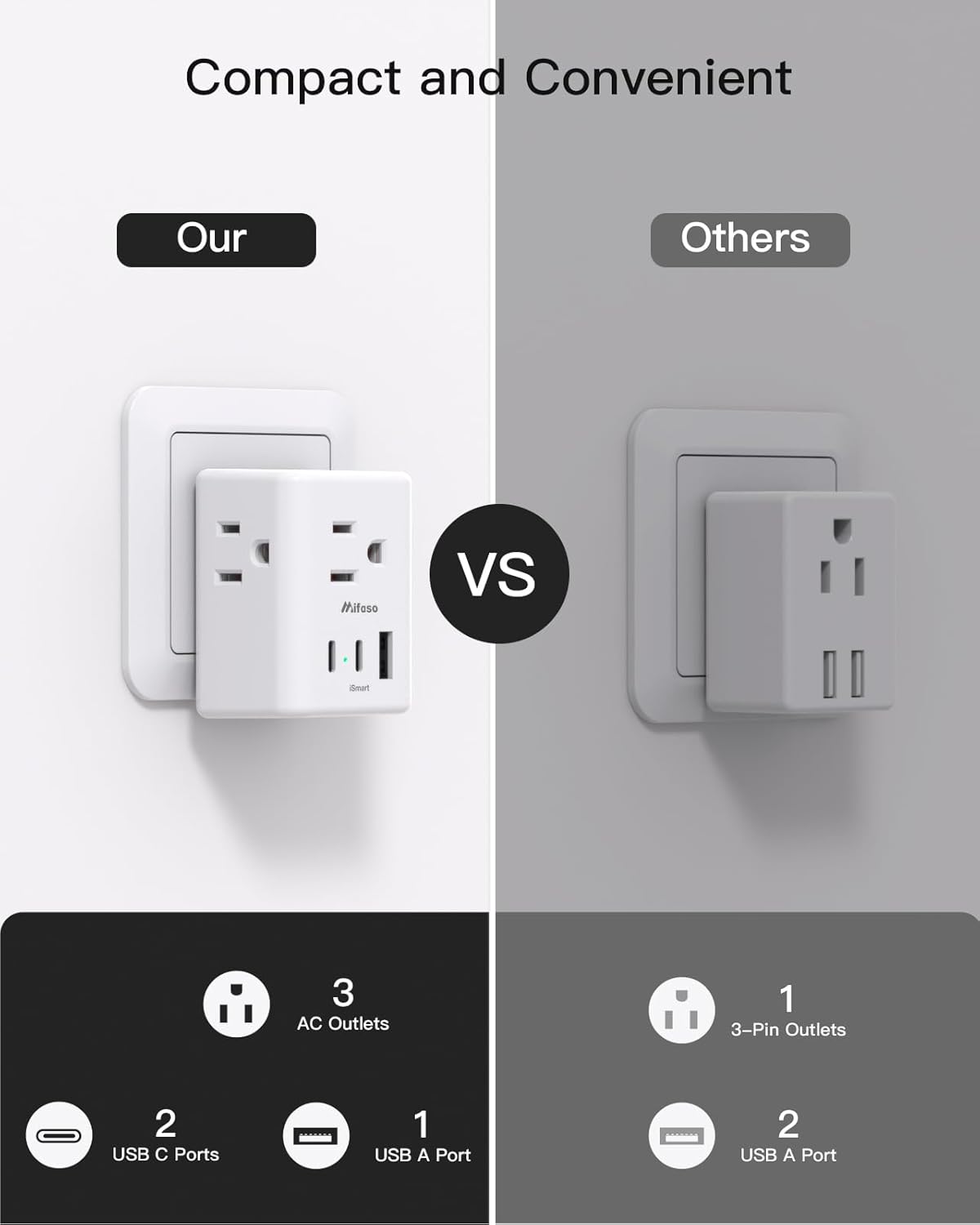 3-in-1 input outlets are compatible with standard North American 2 and 3 prong flat pin plugs. 3 side design with larger space will not block other adapters, that is easier to use for all kinds of equipment.