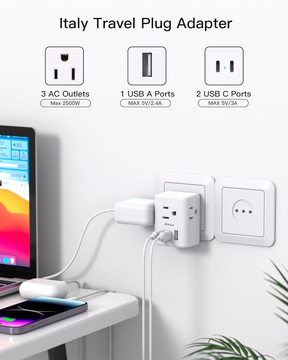 【US to Italy Travel Plug Adapter】- This Type L italy power adapter is compatible with countries such as Italy, Chile, Cuba, Eritrea, Ethiopia, Lybia, San Marino, Syria, Uruguay, Vatican City. (Note: Some hotels may require a 2-prong Type C European travel adapter; please check before traveling.)